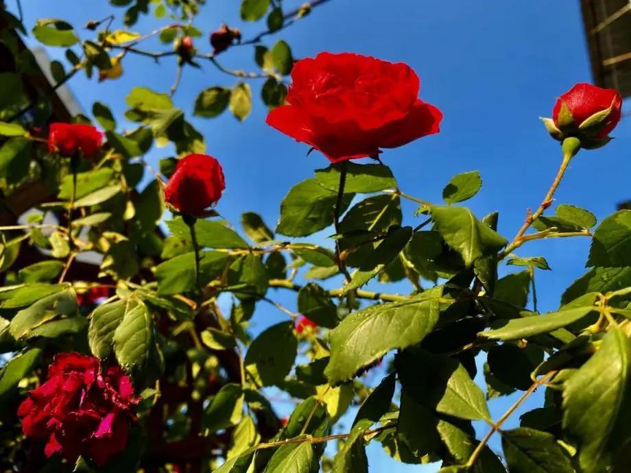 圖解:5月2日,紅薔薇如璀璨的夏日之花,不凋不敗,妖冶如火。這株紅薔薇我養了八年之久,最好的等待,莫過于每當一樹紅花綻放時,便知可愛的夏天來了。